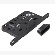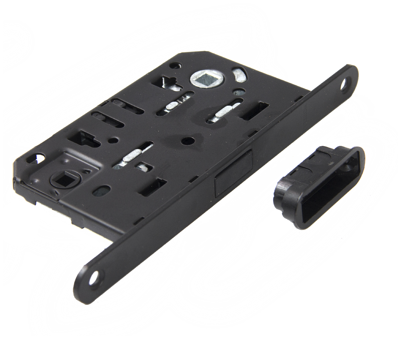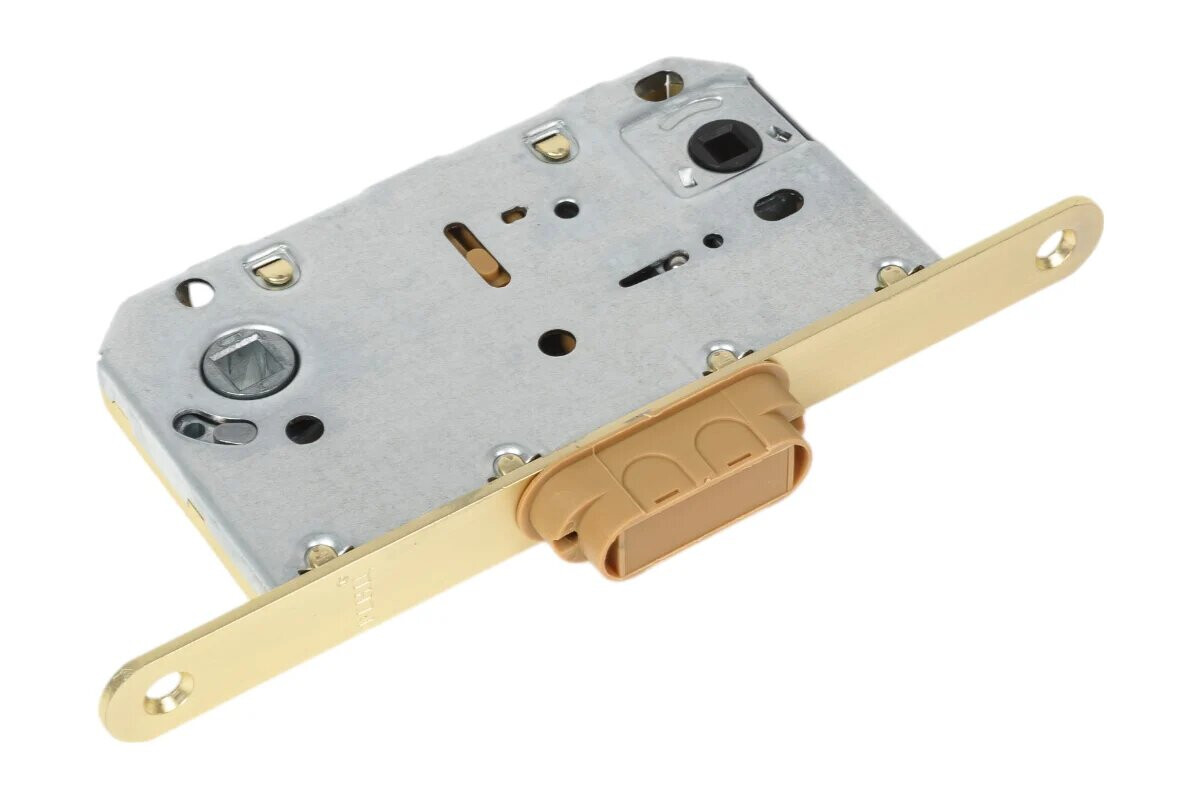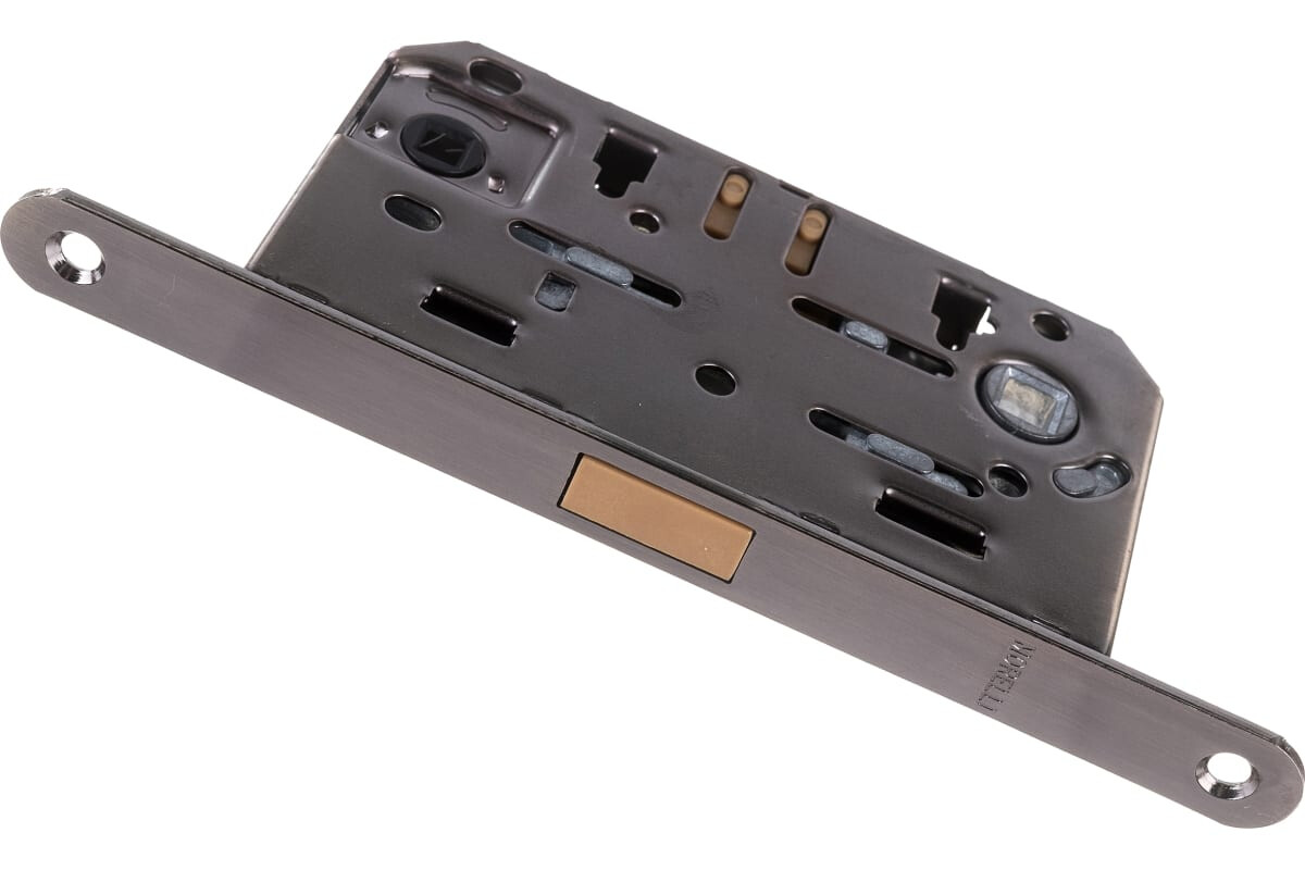 Запирающий механизм действует за счет ручки с углом нажатия 30 градусов. Торцевые части защелки и обратной планки оснащены гальваническим напылением (цвет – матовый никель).